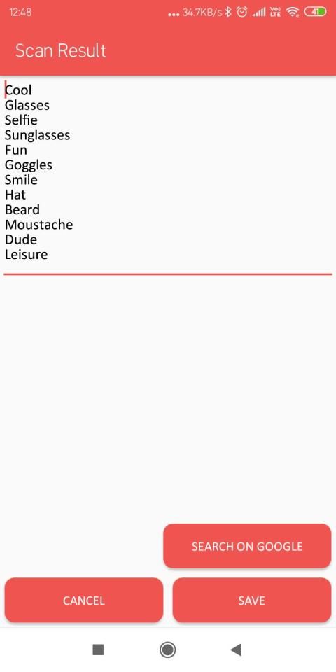 In this scanner will scan all the object showing in an image and give you options to save the text in a file and search on google and share this file to a friend.