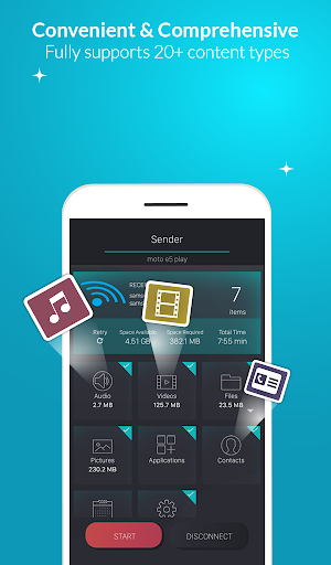 Intuitively share all your personal data to the new phone with this send big files mobile transfer app having exceptional support for android transfer & ios transfer. It quickly copies all the data & serves as best file transfer app, contact transfer app, photo sharing app, messenger migrator and video sharing app. It is efficient data management tool allowing to send large files & transfer contacts from android to iphone and all your old mobile data to new mobile without the privacy loss.