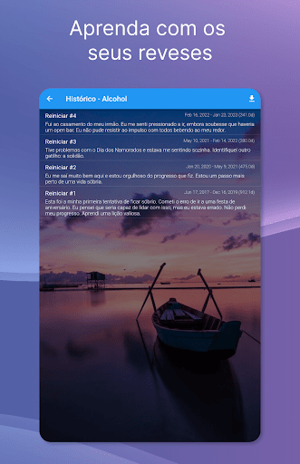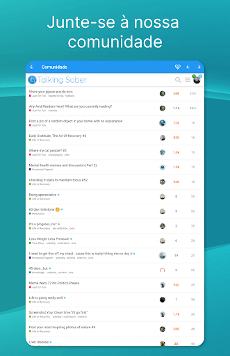 Receba ajuda com o seu vício: O Sober Time tem uma comunidade dedicada onde pode ler ou debater qualquer assunto relacionado com a sobriedade: desde beber até à automutilação. Leia as histórias de outras pessoas, coloque questões, partilhe o seu contador de sobriedade ou debate como é viver em recuperação. Há milhares de membros com conselhos sobre como parar de beber e recuperar da automutilação.