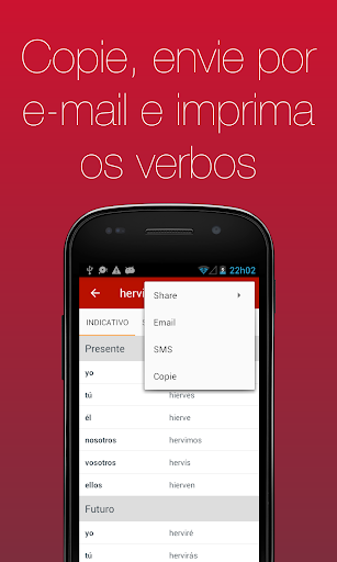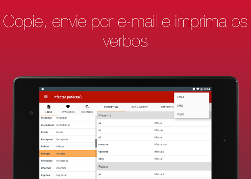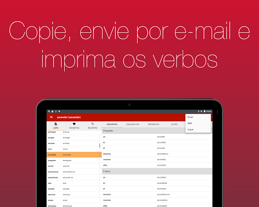 ● Inclui a funcionalidade de copiar os verbos, enviá-los por email e imprimi-los.