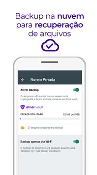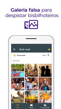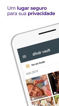 e tenha um lugar completamente seguro no seu celular para guardar fotos e vídeos que ninguém pode ver. Armazene aquelas fotos em uma galeria secreta e protegida com criptografia avançada, cujo backup é feito em sua conta de armazenamento na nuvem, garantindo máxima segurança aos seus melhores momentos, que só poderão ser encontrados e acessados por você. O dfndr vault fica escondido no seu celular com um ícone camuflado, além de ser protegido com senha ou impressão digital, que evita que seus arquivos sejam exibidos para a pessoa errada.