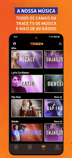 "Trace é a destinação ideal para música e cultura afro-urbanas com o melhor dos canais, estações de rádio e Video On Demand Trace TV. Ligue-se a suas raízes e usufrua de sons e histórias de suas origens.