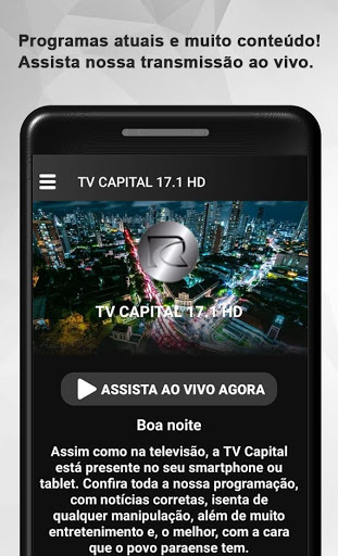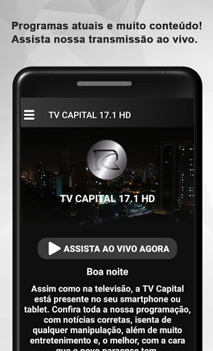 A TV Capital 17.1 HD, em canal aberto, chegou para inovar a maneira de como a informação e o conteúdo de qualidade vão chegar até a sua casa. Ao longo da nossa programação diária, você pode acompanhar tudo através do nosso aplicativo TV Capital, que também está disponível gratuitamente e pronto para o download na plataforma Play Store, em aparelhos Android.