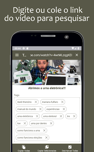 Usar o aplicativo é muito simples. Pressione o botão de busca e digite ou cole o link do vídeo no campo de pesquisa. Ao executar a busca, serão exibidas as tags do vídeo. Essas tags pode ser selecionadas e copiadas para serem utilizadas nos vídeos do seu canal. Além disso, também é possível selecionar e copiar cada tag individualmente através de um clique longo.