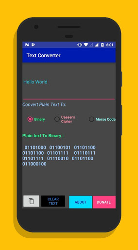 A descrição de Text Converter ( Binary , Morse, Caesar Cipher)
