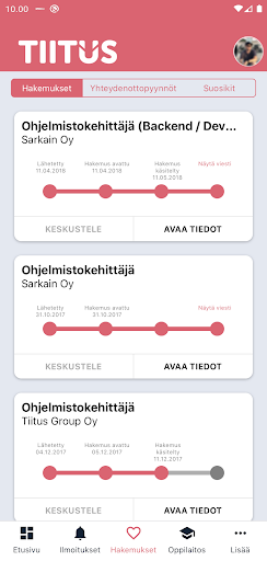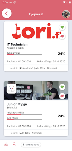 O aplicativo sugere os trabalhos abertos mais adequados para você.A inscrição para um emprego é apenas algumas prensas.Depois de se inscrever em um emprego, você pode monitorar seu aplicativo de emprego no seu telefone ao mesmo tempo.Você também pode conversar com seus empregadores e iniciar uma conversa antes da sua primeira entrevista de emprego.