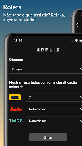 Com um catálogo combinado enorme e repleto de filmes e séries incríveis, pode ser difícil escolher o que assistir. Upflix oferece uma solução que vai impressionar e ajudar você a navegar na Netflix, Globoplay, Prime Video, Disney, HBO Max e Apple TV de forma eficiente.