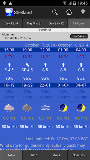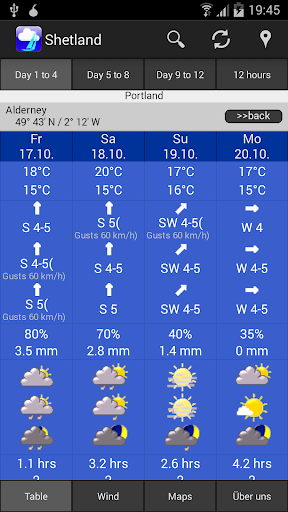 * 12 hrs Forecast in 3 hrs intervals: Temperature; Wind direction; mean wind force; Relative humidity; Weather; Sunshine hours; Peak gusts;
