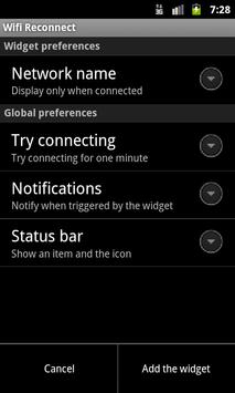 Para acrescentar um widget à tela, clicar Home > Menu > Adicionar > Widgets > Wifi Reconnect