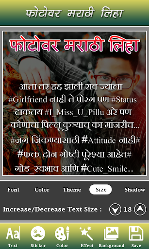 Você pode escrever várias linhas de texto em Marathi nas fotos.Basta baixar este texto Marathi no aplicativo de foto e compartilhar suas fotos facilmente por meio de qualquer aplicativo de mídia social.Texto marathi.Diferentes cores de texto.