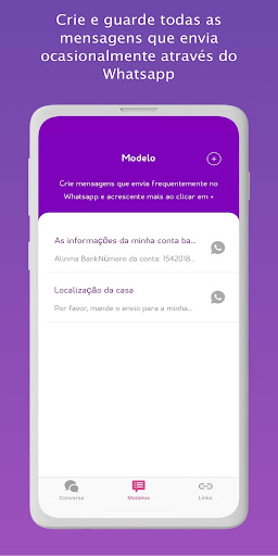 • Grave as mensagens padrão que costuma enviar no WhatsApp. Grave-as no WtsAppy como notas que podem ser partilhadas no WhatsApp em qualquer momento, só com um Clique. Sim, com apenas um Clique! As mensagens padrão podem ser o seu código postal, a sua localização ou a sua conta bancária.