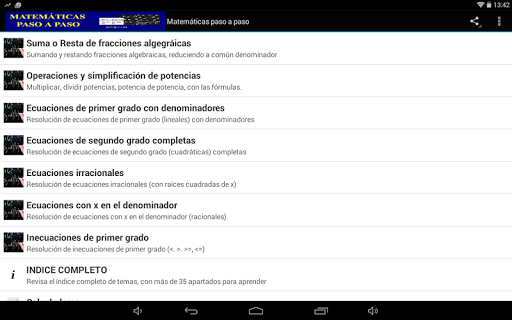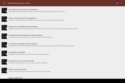 Principalmente temas matemáticos de educação secundária como potências, equações, sistemas, inecuaciones, fracções algébricas, polinômios, função linear, etc