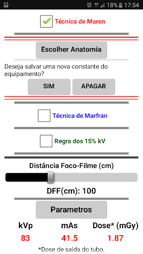 O aplicativo possibilita estimar os parâmetros pelas técnicas de Maron, Marfran e pela regra dos 15%, bem como fornece a dose de saída do tubo e quanto esta dose equivale, em dias, quando exposto a radiação ambiente.