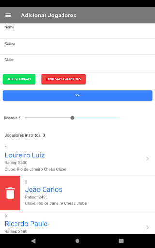 Adicione os jogadores ao torneio e defina o número de rodadas, deverá ter no mínimo 7 jogadores para iniciar o mesmo, você pode excluir jogadores da lista de inscritos deslizando o item para a direita.