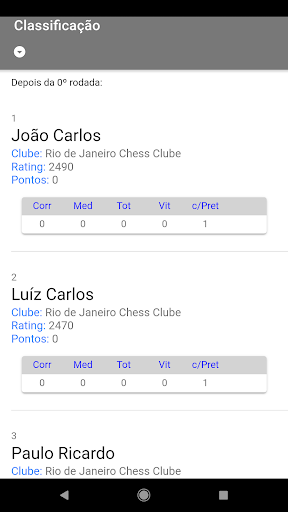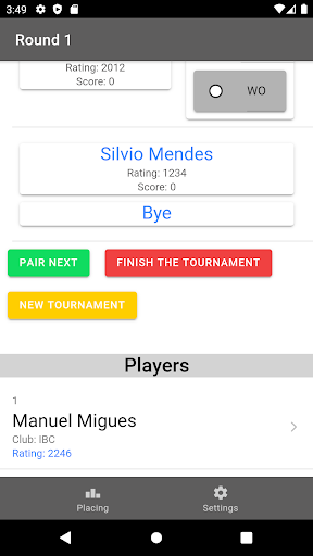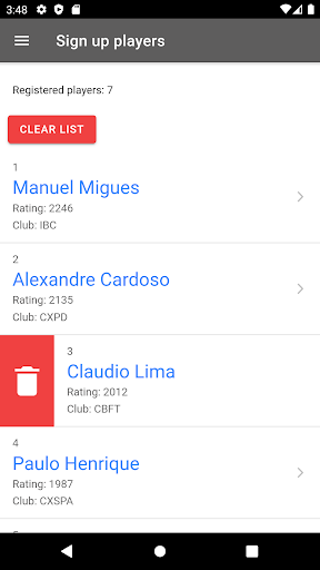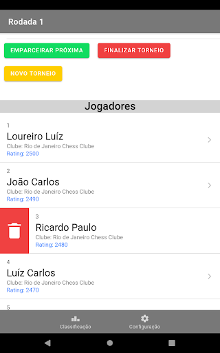 Após o início do torneio, você pode excluir jogadores para as próximas rodadas deslizando o item para a direita, eles não serão excluídos da lista geral ao final do torneio.