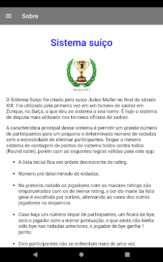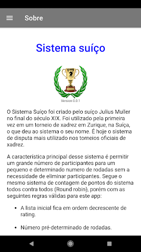 O app utiliza o sistema suíço de competição, administra torneios de forma simples e fácil, sem maiores complicações, pode ser usado para torneios de xadrez, damas e outros esportes.