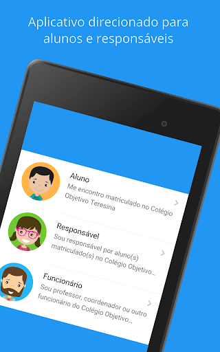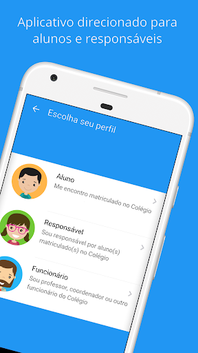 • PRIMEIRO ACESSO INTELIGENTE: O aplicativo utiliza as informações da matrícula já realizada na escola para simplificar o seu acesso;