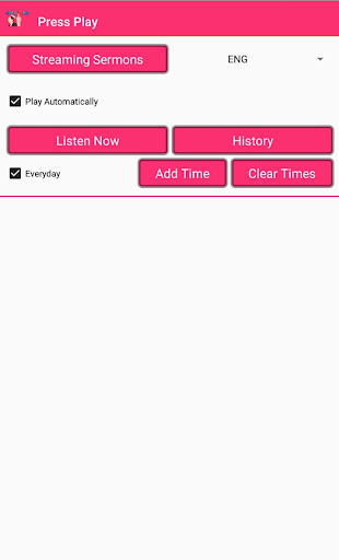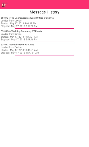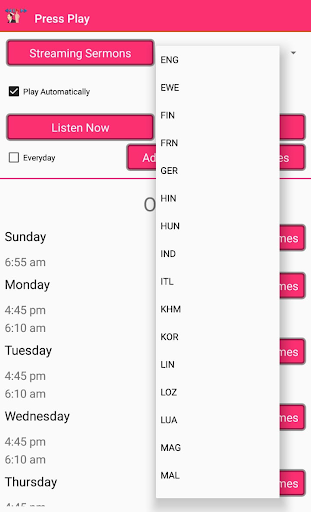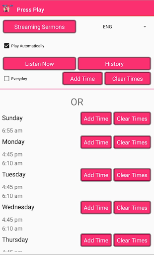 O aplicativo foi criado para aqueles que amam o ministério de fita e para aqueles que procuram estar constantemente em e na pura Palavra de Deus.Tudo o que você faz é selecionar o (s) dia (s) e especificar que horas de cada dia você deseja ouvir uma mensagem.Você pode optar por transmitir ou selecionar uma pasta no dispositivo que mantenha apenas os arquivos de mensagem em ".m4a".Você também pode selecionar para reproduzir o sermão automaticamente.O aplicativo selecionará aleatoriamente uma mensagem para você sintonizar sem qualquer entrada adicional.