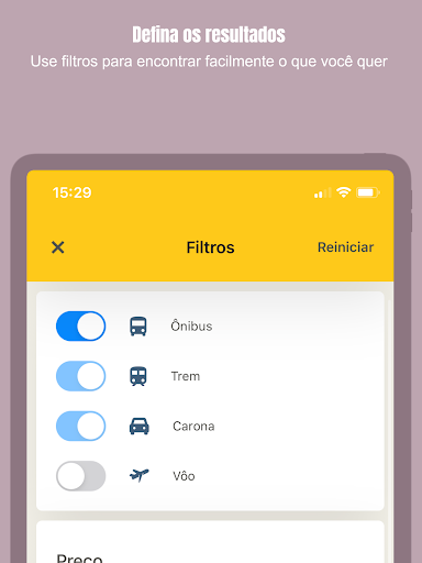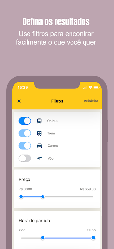 Utilize os filtros para escolher qual rodoviária ou empresa favorita ou excluir determinados modos de transporte. Limite os resultados por preço ou duração da viagem e reserve a sua passagem ideal!
