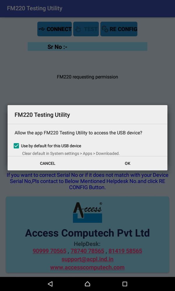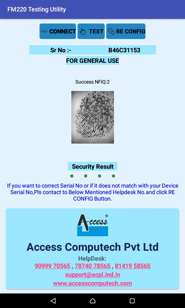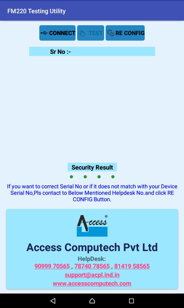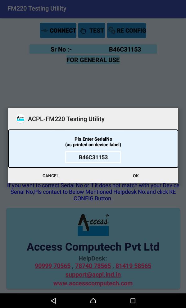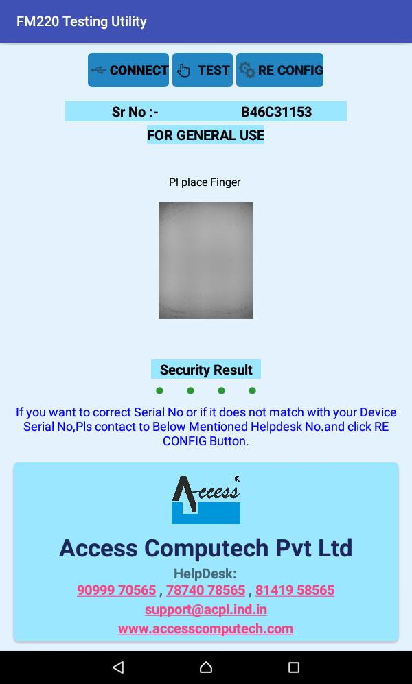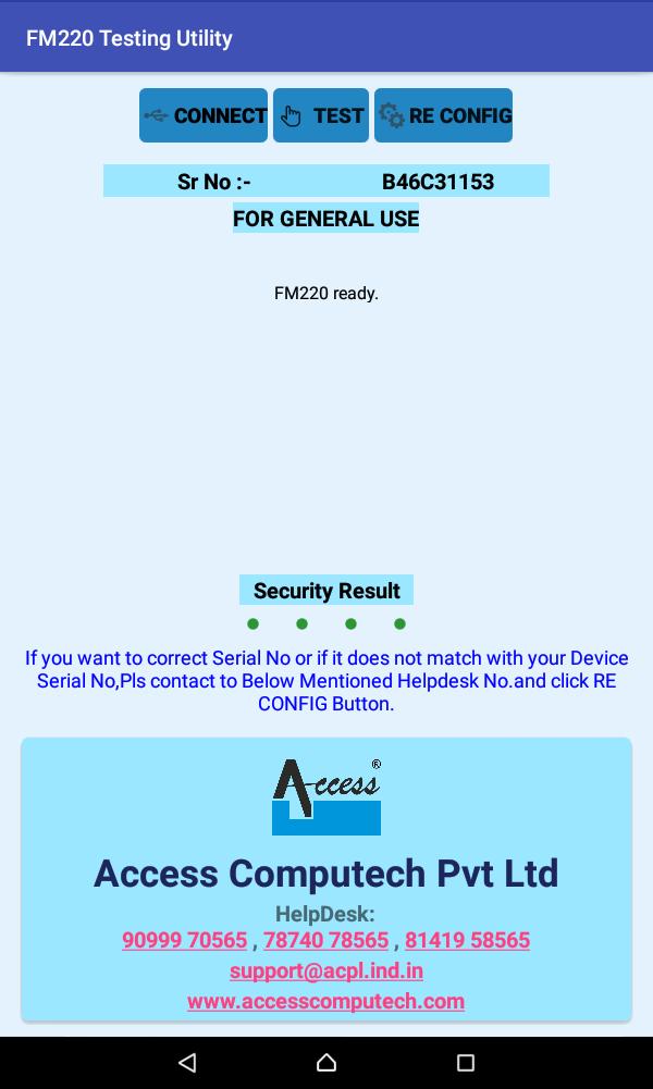 This testing application is to help field staff to identify the FM220 device type and to help diagnose device.