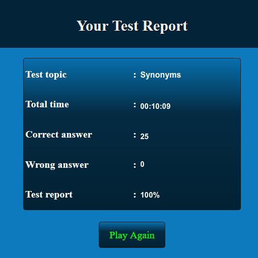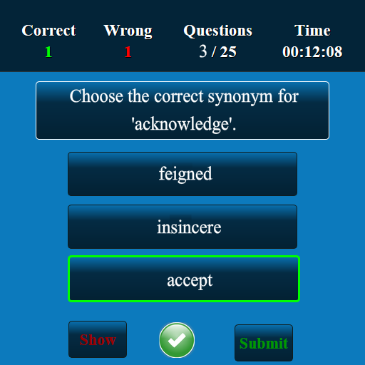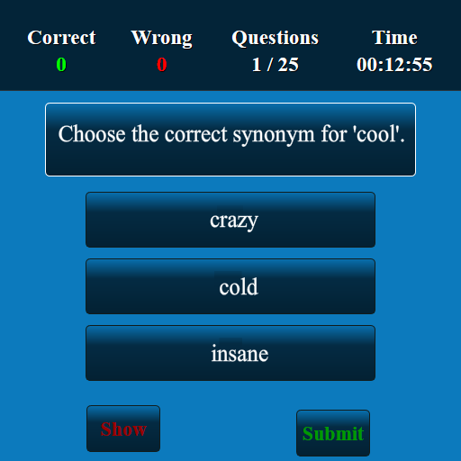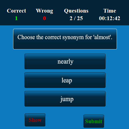 This Synonyms test app has been developed for testing your skills of Synonyms. This app has more than 1,00,000 multiple choice questions and answers. This Synonyms quiz app suits for all lower, intermediate and higher levels. The questions at all levels will be displayed randomly. The user can improve Synonyms knowledge and user can score well in high school, college and competitive level examinations. This is a free version and you can be used in both offline and online.