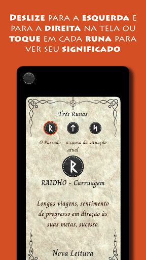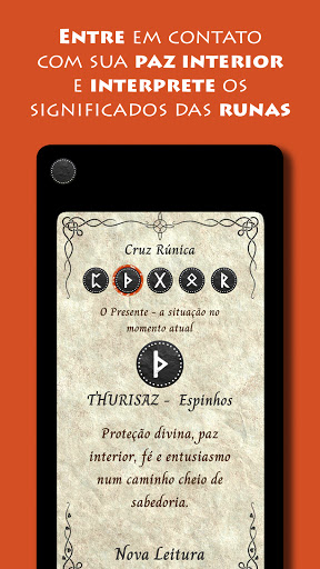 Após mentalizar sua pergunta, aperte o botão na base da Cruz Rúnica. Espere até que sua adivinhação apareça, então toque na Cruz Rúnica para ver e interpretar sua leitura. Deslize para a esquerda e para a direita na tela ou toque em cada runa para ver seu significado.