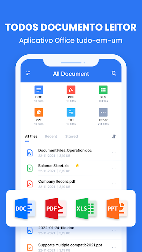 Este aplicativo visualizador de documentos é totalmente compatível com arquivos do Word Office, incluindo Word, Excel, Docx, arquivo, ppt e arquivo de documentos txt, arquivo de documento PDF.