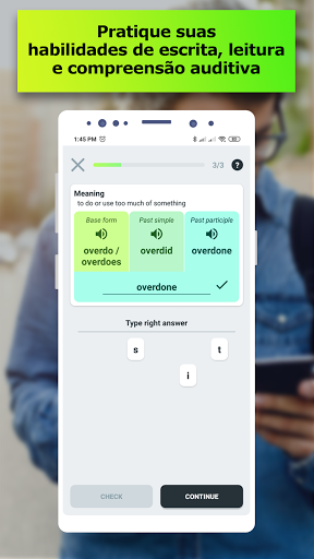 Existem fichas de vocabulário com tempos verbais na primeira parte da lição. Você pode ouvir a pronúncia correta, ver a definição, tradução e até cinco exemplos de uso. Se você já conhece esse verbo irregular, pode pulá-lo e prosseguir com o próximo. Depois disso, você deve passar por um teste para consolidar os verbos irregulares já aprendidos para definir seus pontos mais fracos. Na terceira parte da lição, você precisa escrever todas as formas do verbo usando o teclado aparecido. Na atividade prática, você deve preencher a lacuna na frase usando a forma correta do verbo irregular necessário. Você também pode escolher um objetivo para o dia e acompanhar seu progresso com uma interface conveniente. Para obter os melhores resultados e não permitir que se esqueça da repetição, adicionámos notificações.