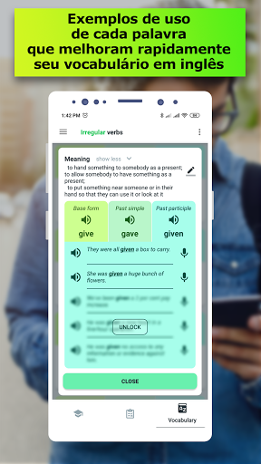 A ficha (flashcard) de vocabulário para cada verbo irregular vem com um conjunto de tempos verbais, definição completa em inglês, traduções multilíngues, até cinco exemplos de uso, fonética e pronunciado com diferentes sotaques em inglês, para que você possa perceber imediatamente a fala de ouvido. Graças à técnica de aprendizagem única, você sempre terá em mente a grafia correta da palavra.