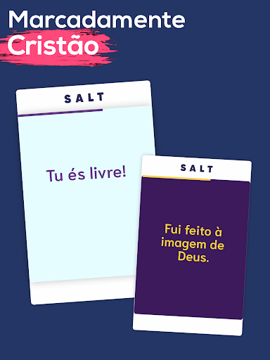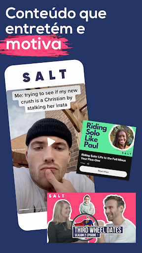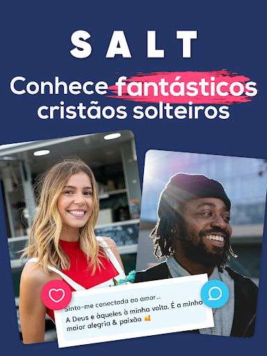 SALT é um app premiado de namoro cristão que tem sido divulgado nos meios de comunicação global como a BBC, GQ, etc. O SALT foi feito por cristãos para cristãos. Junte-se hoje a milhares de cristãos solteiros. Você pode descobrir outras pessoas, dar match e enviar mensagens gratuitamente, ou adquirir a assinatura para obter funcionalidades extras.