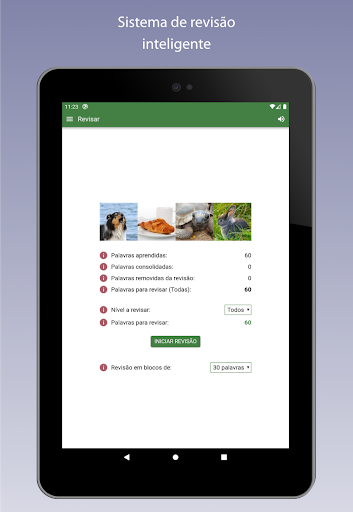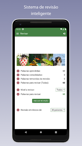 - Modo de revisão inteligente que assegura que você repete as palavras regularmente de acordo com os seus acertos e erros. Quanto mais vezes você não sabe uma palavra, mais frequentemente é pedida para mantê-la na sua memória.