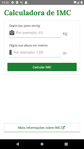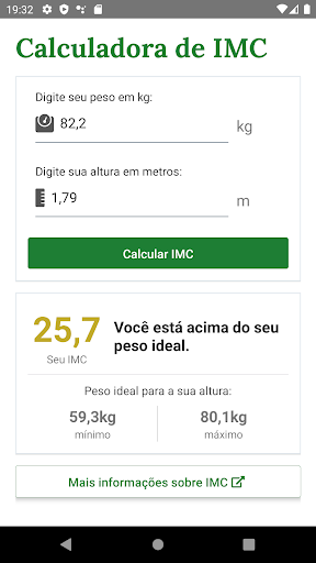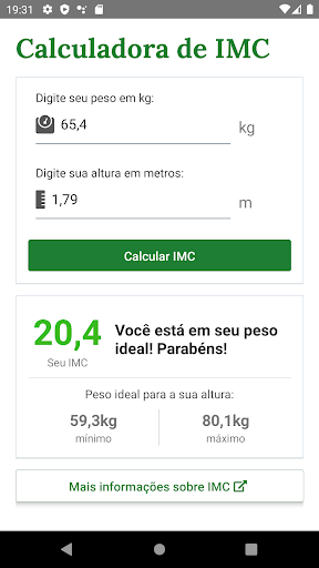 Este aplicativo calcula o Índice de Massa Corporal (IMC) de uma pessoa, de acordo com seu peso e altura. Você pode calcular seu IMC, tirar suas dúvidas e saber se está acima do seu peso ideal.