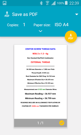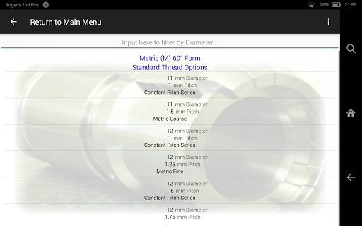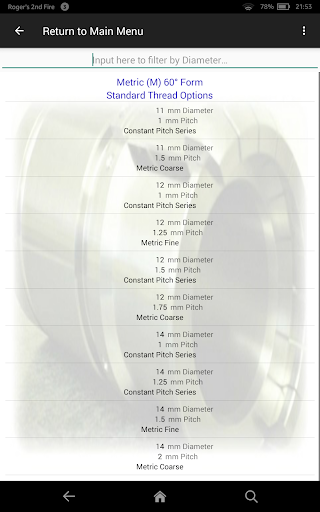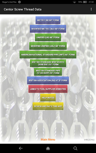 Uma versão premium está disponível com a seleção de rolagem a partir da listagem completa de todos os tamanhos padrão ou para aceitar a entrada digitada de qualquer combinação não padrão de diâmetro & Pitch / tpi no e quivalent de R $ 7,49 (impostos e taxas locais) - Use atualizar ligações dentro desta versão de teste ou ir ao Google Play Store e procure ‘CENTORPE’. Observe que, ao atualizar, a versão de avaliação permanecerá no seu dispositivo até ser desinstalado manualmente.