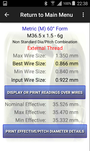 Software calcula o intervalo de tamanhos de fio / pinos aceitáveis e qualquer PIN disponível que esteja dentro dessa faixa permitida calculada pode ser uma entrada. As leituras calculadas fornecem medições necessárias para a inspeção de rosca de corte e rosca parafuso usando o método de 3 fios ou tolerâncias eficazes / diâmetros de pitch são fornecidos para uso com métodos de medição direta.