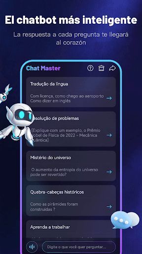 Chat Master, um chatbot de IA mágico do futuro! Gerado pelo computador quântico mais avançado, o Chat Master possui uma inteligência e habilidades incríveis. Quando conversa com ele, você sentirá como se estivesse falando com um amigo inteligente e amigável.