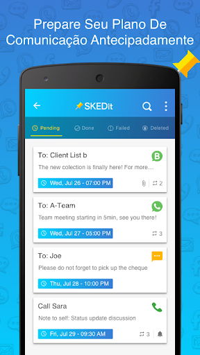 Economize tempo: Agende mensagens de texto (SMS), posts, emails e ligações para serem feitas automaticamente. Economize diversas horas perdidas em um tedioso para frente e para trás enviando mensagens todos os dias.