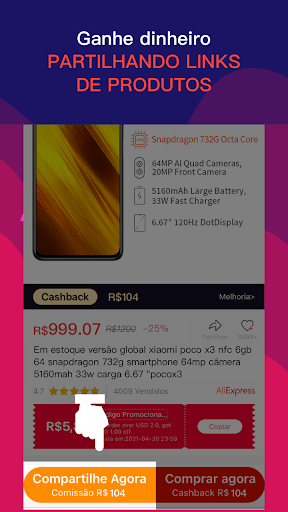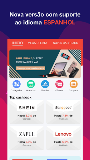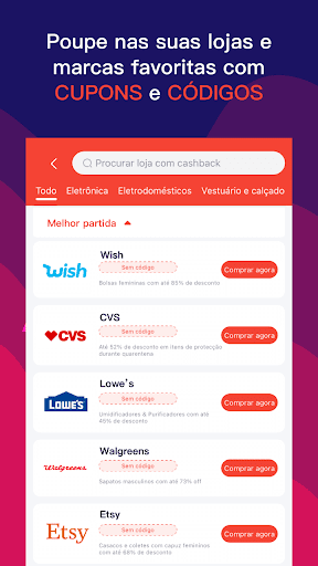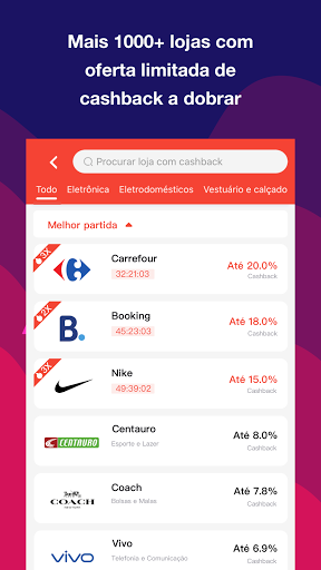 - Obtenha cupons e cashback nas inúmeras lojas de excelência on-line.