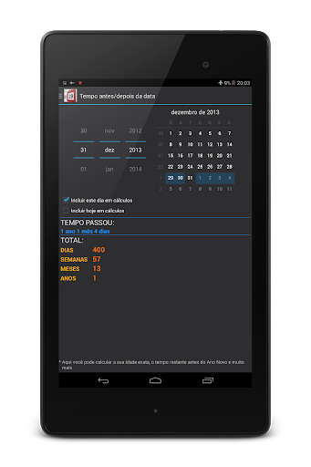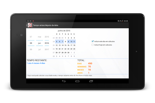 O programa realiza manipulações matemáticas com datas. Apropriado para o cálculo do número de dias passados pelo paciente no hospital, bem como cálculos semelhantes para cama (ocupação em hotéis e assim por diante). Pode ser muito útil para cálculos rápidos na ausência da vista do calendário. Usando o programa você pode descobrir quantos dias você vive no mundo, o quanto é deixada para datas importantes e mais