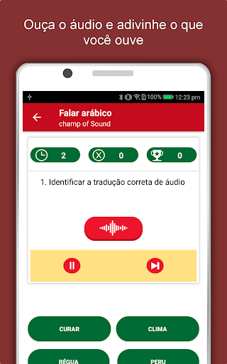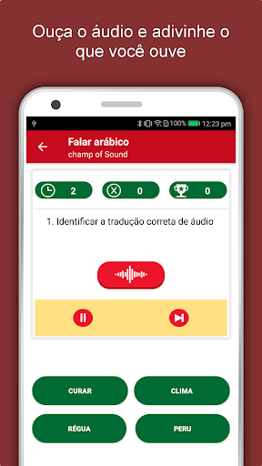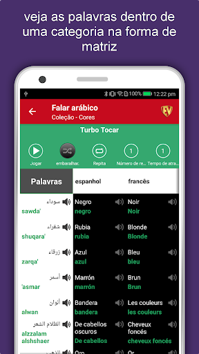 O aplicativo de aprendizado em árabe offline tem 2135 palavras com 55 categorias. Contém pronuncias, imagens e fonética de palavras para facilitar a aprendizagem. Alterar a língua de base, Salvar aprendizagens em EduBank, jogos de áudio, Potpourri e jogos de retenção são as principais características do aplicativo Falar arábico.