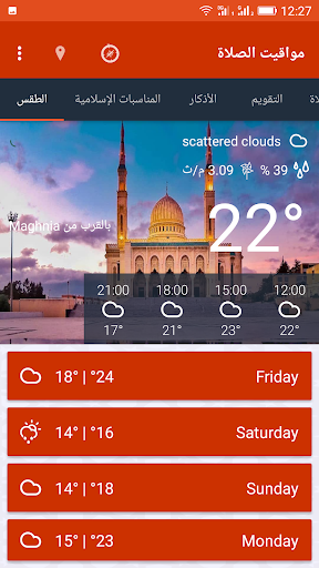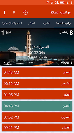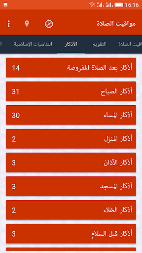 - o widget horizontal que mostra a barra de tempo entre a oração anterior e a seguinte. - Aviso para cada lembrete de oração e alojamento, com a possibilidade de modificar seu tempo. - A capacidade de escolher o tom da notificação (Azan) do SD Cartão. Converta o telefone para silenciar automaticamente durante os tempos de oração, com configurações para cada oração. - Pesquisar automaticamente usando a rede ou GPS ou manualmente pesquisando on-line. - Bússola para mostrar a direção do qibla. - O alarme do amanhecer (Suhoor), pode ser Ajustado das configurações. - Conversor de histórico, para converter hijri para o meu anúncio e vice-versa, e calcular orações para essa data. - A capacidade de ajustar os tempos de oração manualmente. - Pode ser usado em inglês ou árabe, e cor, branco ou preto .