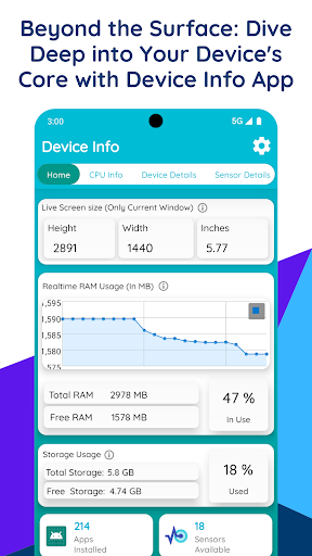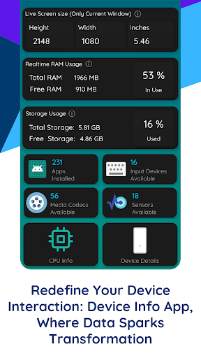 Mostra o nome do seu processador, hardware da CPU, ABIS, arquitetura, núcleos de processador, governador da CPU, tipo de CPU, driver da CPU, CPU mínimo e frequência máxima, CPU de corrida ao vivoLista, porcentagem de uso da CPU, bogomips, suporte de vulcanos, renderizador de GPU, fornecedor e versão