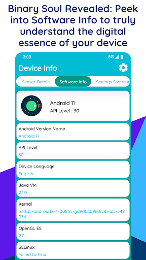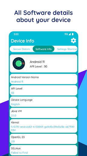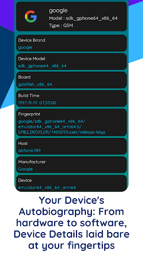 Nome da versão do Android, nível Android SDK, linguagem de dispositivo, Java VM, kernel, versão do OpenGL ES, nível de patch de segurança, carregador de inicialização, acesso a raiz, versão do Google Play Services e System Uptime