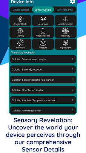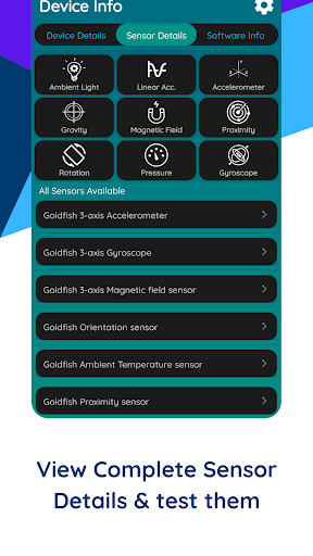 Os detalhes do sensor mostram todos os sensores disponíveis no seu dispositivo.Recursos de todos os sensores, incluindo seu poder, faixa e atraso máximo e mínimo, fornecedor, versão e resolução.