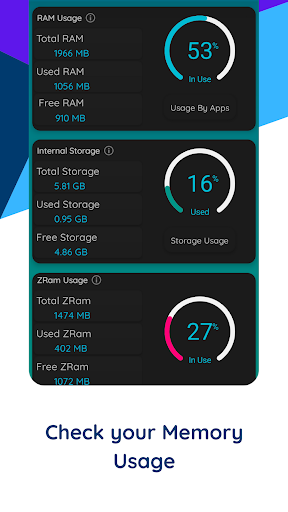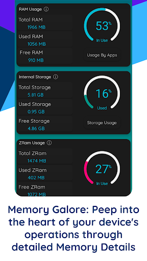 Isso mostra seus detalhes de armazenamento, RAM, ZRAM, armazenamento do sistema e armazenamento externo.Ele mostra a memória total disponível, a memória sem memória e a memória usada.