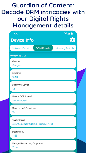 Detalhes do CDM widevine, como seu fornecedor, versão, nível de segurança, nível máximo de HDCP, número de sessões máximas, algoritmos, ID do sistema, suporte de relatórios de uso e nível de HDCP.