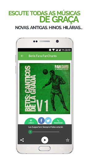 para serem tocadas onde e quando você quiser, mandar para os amigos e usar como toque do seu telefone. Receba alertas de novos cantos do Real Betis e use o recurso de gravação do app para enviar novos cantos.