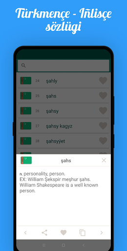 Türkmen diliniň düşündirişli sözlügi Türkmençe - Iňlisçe sözlügi Iňlisçe - Türkmençe sözlügi * Üç sözlük bir programmada * Internet birikmesiz (offline) * 56 000 sözler we sözlemler * Iň täze we ulanmasy ýeňil