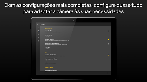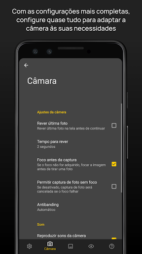 ● Suporta outras características padrão como temporizador, captura de explosão, suporte de obturador remoto Bluetooth, geolocalização, revisão automática de imagem, galeria integrada, visor de ecrã inteiro ou foco táctil.