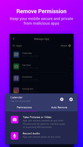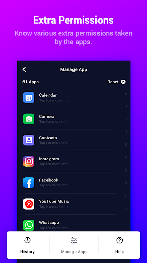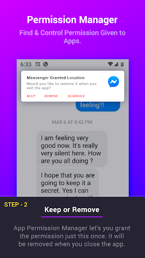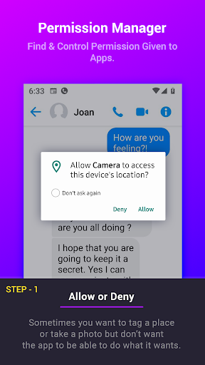 Sabemos que sua privacidade e segurança é uma das coisas mais importantes em termos de controle e conhecimento. O gerenciador de permissões dá-lhe o poder de ser sempre informado e ter a capacidade de controlar sem você mesmo saber com suas informações mais sensíveis, como localização, contatos, câmera e até mesmo microfone. Dá-lhe a capacidade de conceder permissões temporariamente. Assim que você sair do aplicativo, o Permition Manager removerá automaticamente a permissão para você em um instante para que você possa voltar a fazer o que você faz melhor, sem ter que se preocupar com aplicativos invadindo sua privacidade e desperdiçar sua bateria.