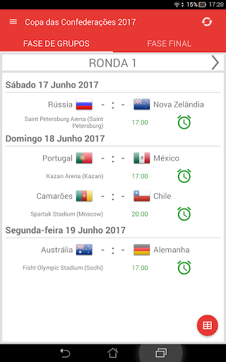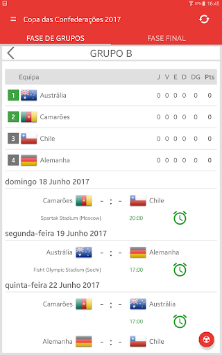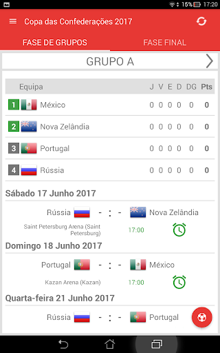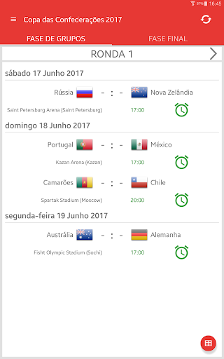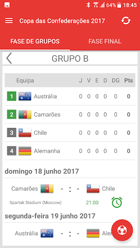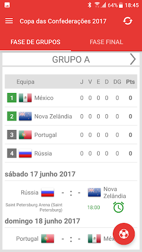 Resultados para o Copa das Confederações de 2017 é o aplicativo que permitirá que você acompanhe os jogos do torneio internacional de futebol masculino na Rússia, mesmo que você não tenha a possibilidade de assistir TV ou transmissão ao vivo. Inclui um cronograma das partidas, uma tabela de grupos, resultados ao vivo e determinará quais equipes serão qualificadas para a fase eliminatória. Com o aplicativo você não vai perder um Golo ou começar de uma partida, porque ele irá enviar-lhe um push-notificações. Você pode selecionar as correspondências favoritas e receber notificações apenas para elas. Na Confederations Cup 2017 jogue as equipas: Rússia, Alemanha, Austrália, Chile, México, Nova Zelândia, Portugal e Camarões.